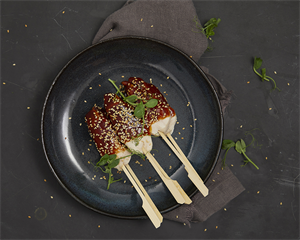 Kyllingfilet på spyd marinert med ingefær og asiatiske krydder, toppet med sesamfrø