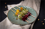 Gremolatamarinerte bakte beter og sellerirot på spyd med Za'atar, yoghurtkrem, sesamfrø, ristede hasselnøtter og spirer - Yoghurtdipp serveres i egen skål.